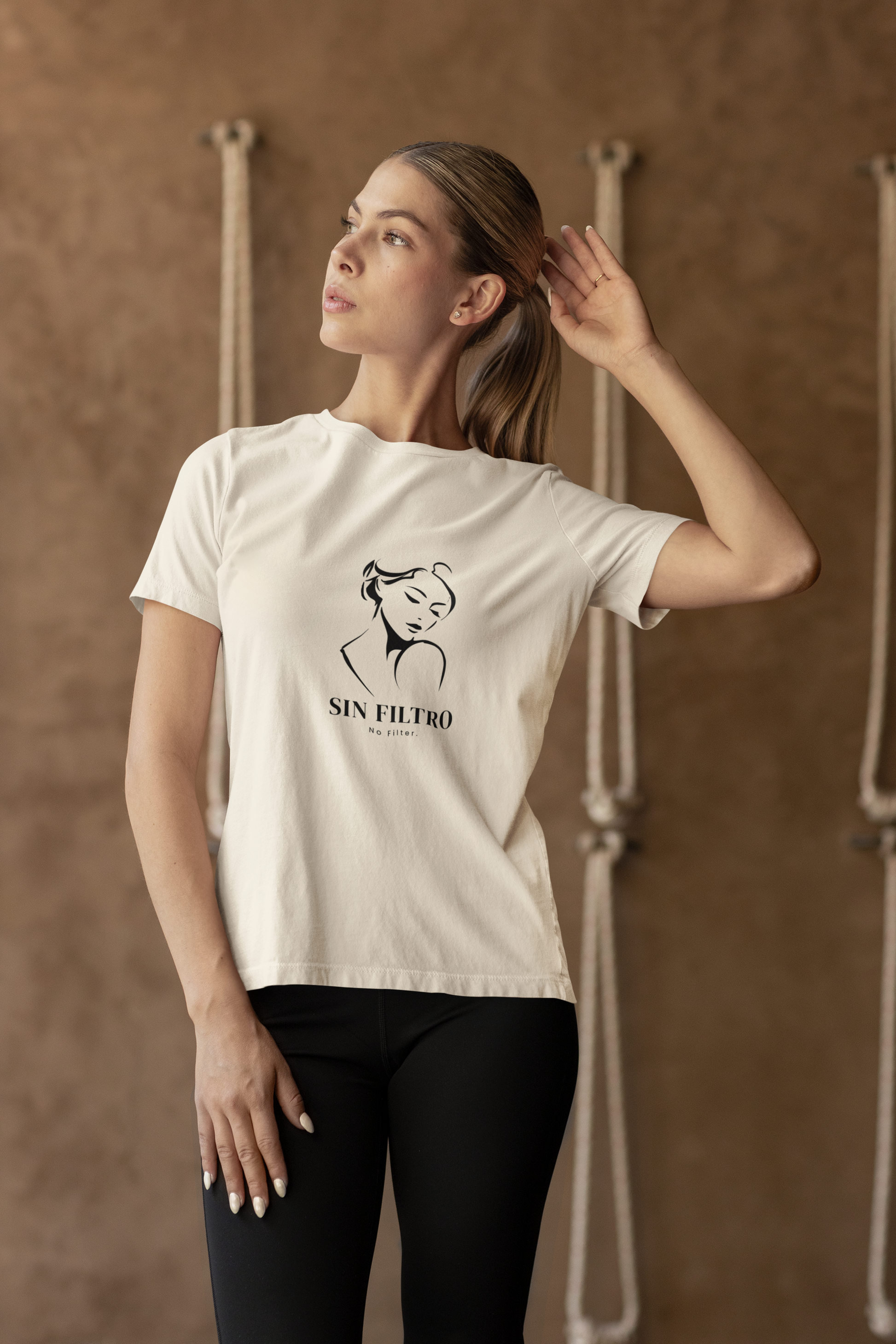 - Stunning line-art woman silhouette paired with the empowering bilingual phrase Sin Filtro / No Filter, art and attitude in one